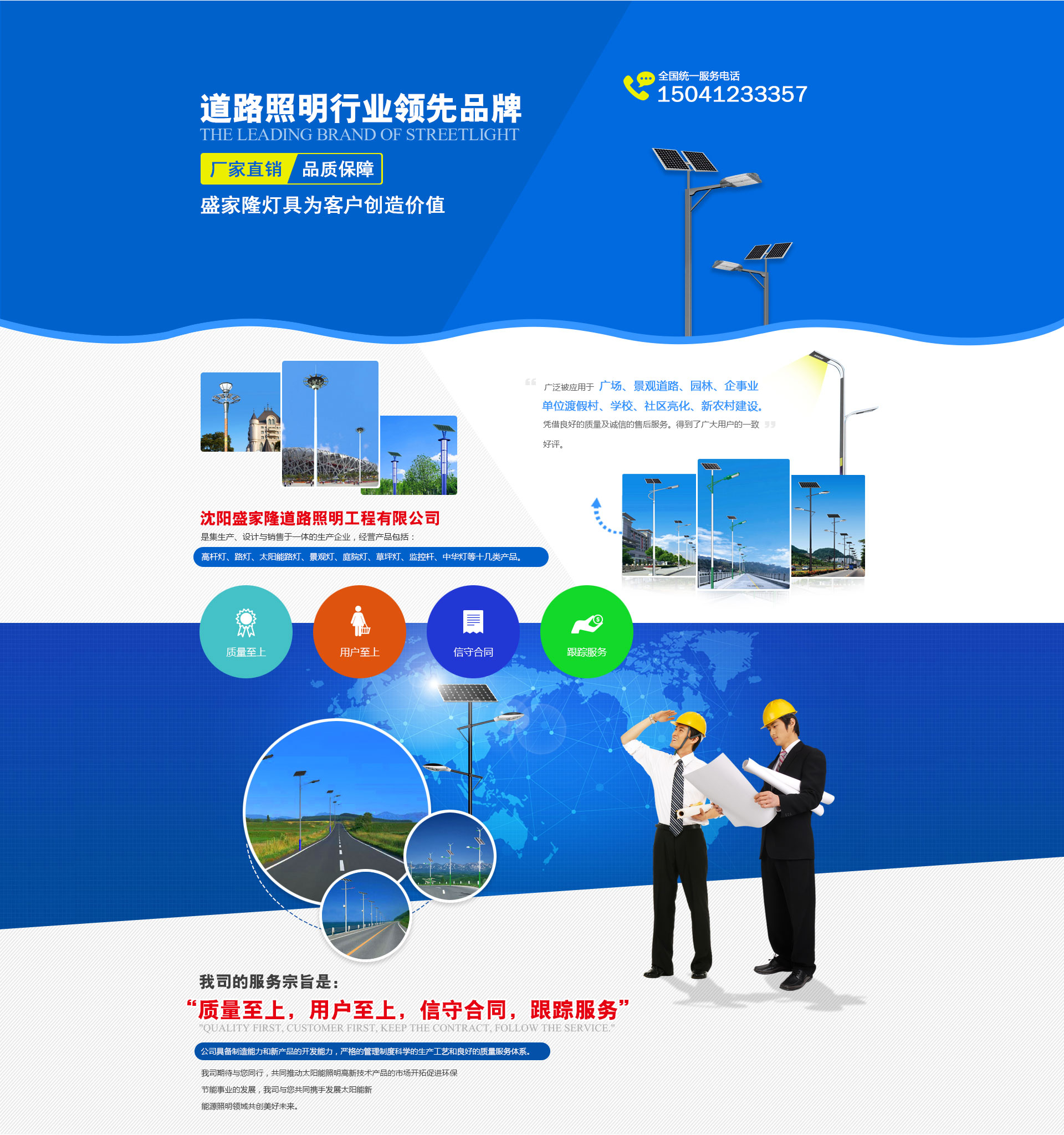 沈陽(yáng)盛家隆道路照明工程有限公司坐落于沈陽(yáng)市于洪區(qū)興盛村愛(ài)國(guó),生產(chǎn)各種室外,道路,廣場(chǎng),車(chē)站,碼頭,橋梁,庭院及室內(nèi)工礦照明燈具,品種有太陽(yáng)能路燈,道路燈,LED路燈,組合燈,景觀燈,庭院燈,草坪燈,彩色泛光燈,中高桿燈以及配套使用的各種路燈頭,鎮(zhèn)流器,觸發(fā)器開(kāi)關(guān)箱等系列產(chǎn)品。 本公司自成立以來(lái),已初具規(guī)模,現(xiàn)有高級(jí)技術(shù)人員5人,中級(jí)技術(shù)人員28人,研究設(shè)計(jì)人員14人,車(chē)間工人百余人,并備有大型斬彎?rùn)C(jī),1600t-900t壓鑄機(jī),20t行吊,高速縱剪機(jī),埋弧自動(dòng)焊,彩色噴塑線(xiàn)燈先進(jìn)設(shè)備,高科技創(chuàng)造高質(zhì)量,由我公司生產(chǎn)的各種類(lèi)型的照明燈具,不僅質(zhì)量可靠而且線(xiàn)條流暢,外形美觀,深受廣大客戶(hù)的喜愛(ài),長(zhǎng)期以來(lái),我公司一直注重產(chǎn)品質(zhì)量,堅(jiān)持“質(zhì)量是企業(yè)的生命”的宗旨。由于質(zhì)量可靠,價(jià)格合理,服務(wù)周到,從而贏得了廣泛的市場(chǎng)聲譽(yù)。企業(yè)先后被評(píng)為“質(zhì)量信得過(guò)企業(yè)”“重誠(chéng)信守信用企業(yè)”,“AAA級(jí)資信企業(yè)”,并通過(guò)ISO9001:2000國(guó)際質(zhì)量體系認(rèn)證,ISO14001:2004環(huán)境管理體系認(rèn)證,CCC,CQC國(guó)家強(qiáng)制性產(chǎn)品認(rèn)證和持有道路照明二級(jí)安裝,安全生產(chǎn)資質(zhì)。